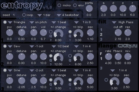 Entropy — это трёхосцилляторный вычитающий синтезатор с набором случайных функций изменения высоты звука для генерации собственных мелодий.