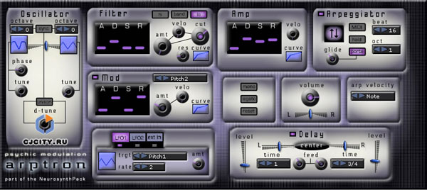 Arptron - гибридный синтезатор с двумя осцилляторами (один - VA, один - основанный на искажении фазы). В нем так же есть встроенный стерео эффект дилэя.